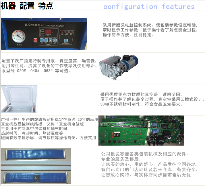使用說明;1.插上電源插頭.交流220伏.2.打開電源按扭于開位置.3.調(diào)節(jié)抽氣時間(一般30-35秒左右).4.調(diào)節(jié)加熱(封口)時間(一般2.5-3.5秒).5.裝好物品.放置箱內(nèi)在封口處.6.按(壓)下頂蓋(有機玻璃蓋.看到真空表指針走動手松開)即可自動操作.真空表回零即工作完成.